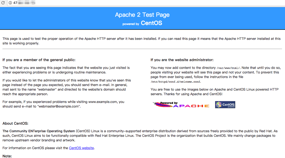 6. 打开本地浏览器,并访问 云产品资源 提供的 ECS实例的 弹性IP ,可以查看到 Apache 的测试页面。证明 Apache HTTP 服务部署启动成功。