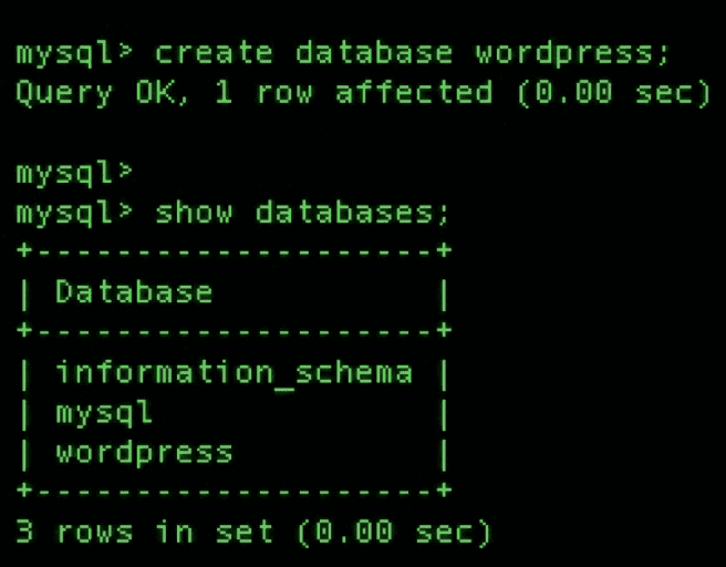 5. 输入以下命令,创建数据库 wordpress ;然后,再次验证数据库信息,可以看到刚才创建新增的数据库wordpress 。说明新的数据库 wordpress 已在 MySQL中创建成功。