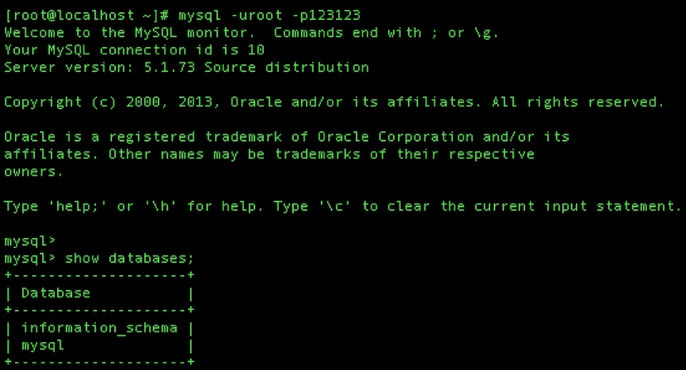 4. 输入如下命令,进入 MySQL 数据库;然后,查看root账号下的数据库信息。
