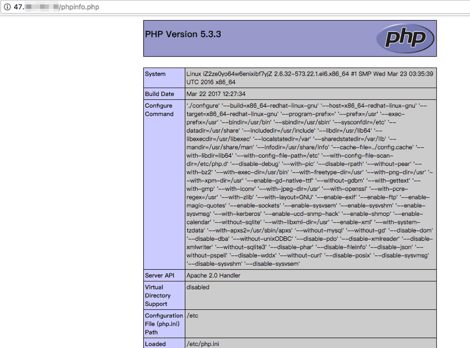 5. 返回浏览器,并在新建页面中,访问http://xxx.xxx.xx.x/phpinfo.php,其中 xxx.xxx.xx.x表示 实验资源 中的 ECS 实例 弹性IP,可以查看到如下 PHP 信息页面: