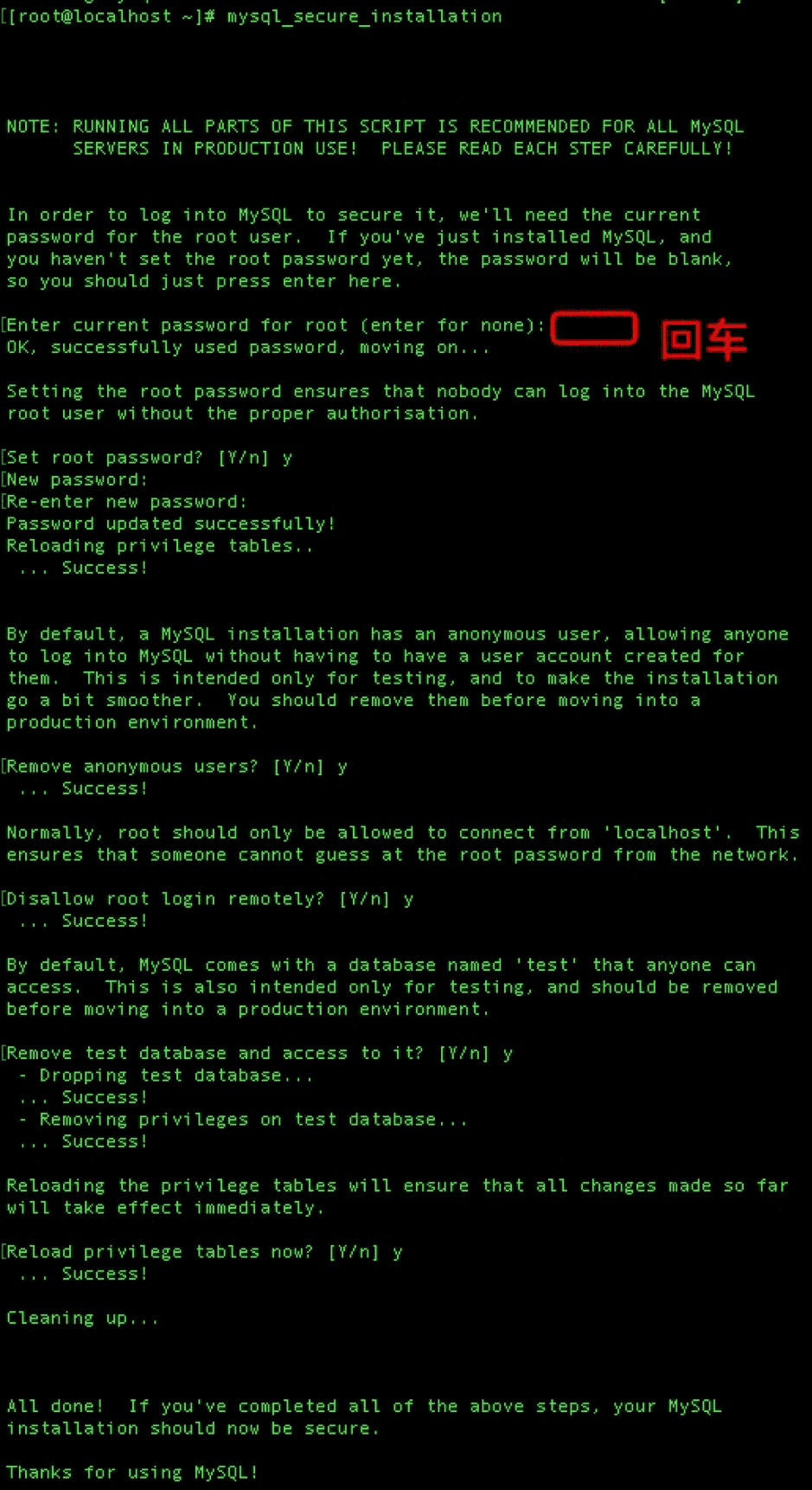 - 默认密码为空,所以提示 Enter current password for root (enter for none) 时,输入 回车(enter) 就可以。