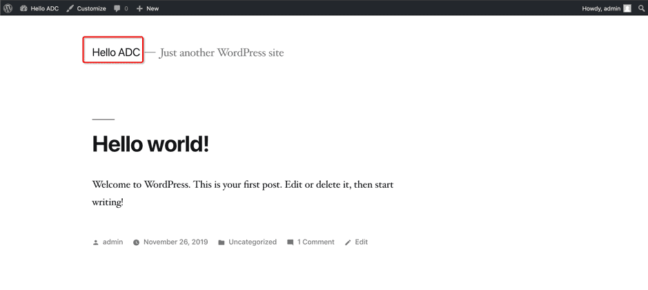 就可以进入安装好的 WordPress 网站的管理页面,后续所有 WordPress 网站的管理和优化都是在此页面中进行操作的。下图红框中 Hello ADC 表示我们设置的 站点标题 。