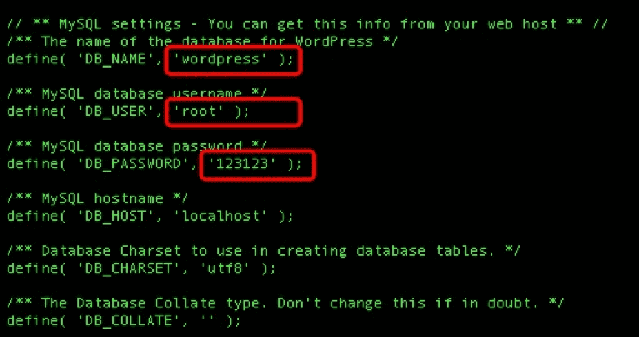 - 修改 DB_USER 的参数值 username_here 为 root :