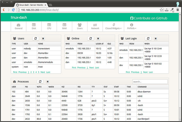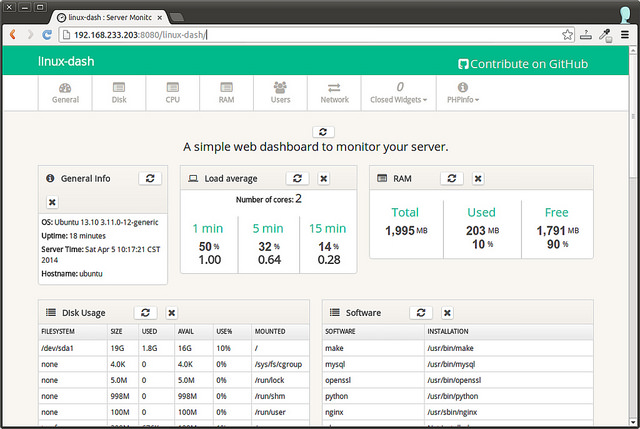 下面是linux-dash的截图。web面板包含了几个小部件,每个都会显示特性的系统参数。你可以通过重安排并且/或者关闭一些小部件来自定义web面板的外观。这里是一个linux-dash创建者的演示站点。