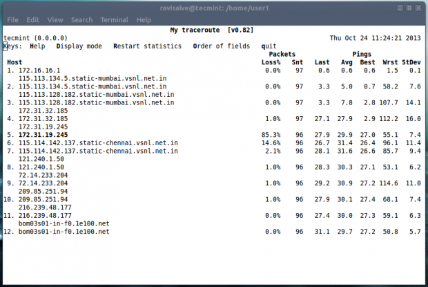 # yum install mtr (On Red Hat based Systems)现在运行mtr命令,开始查看mtr运行的主机和google.com直接的网络连接。