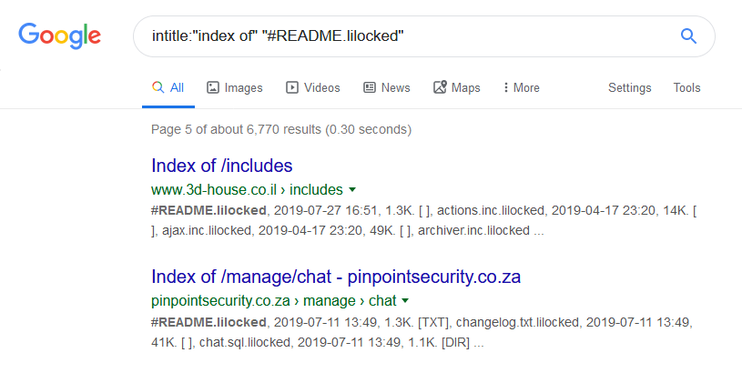 这意味着受感染的服务器继续正常运行。根据法国安全研究员 Benkow 的说法,Lilocked 已经加密了超过 6,700 台服务器,其中许多服务器已被索引并缓存在 Google 搜索结果中。