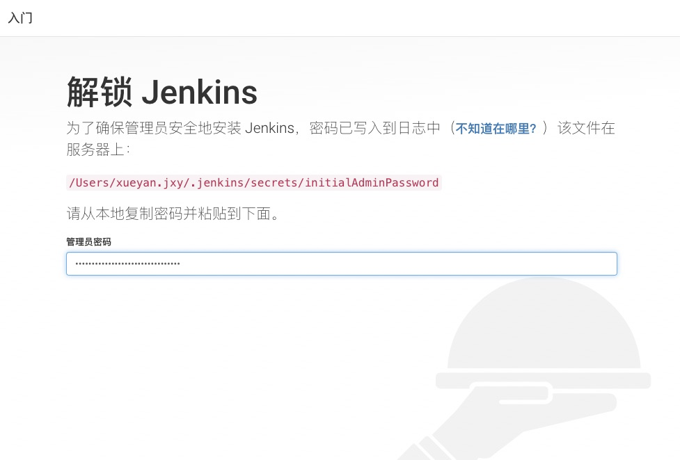 安装成功启动jenkins,终端命令输入:jenkins-lts,打开浏览器输入localhost:8080,即可进入jenkins页面