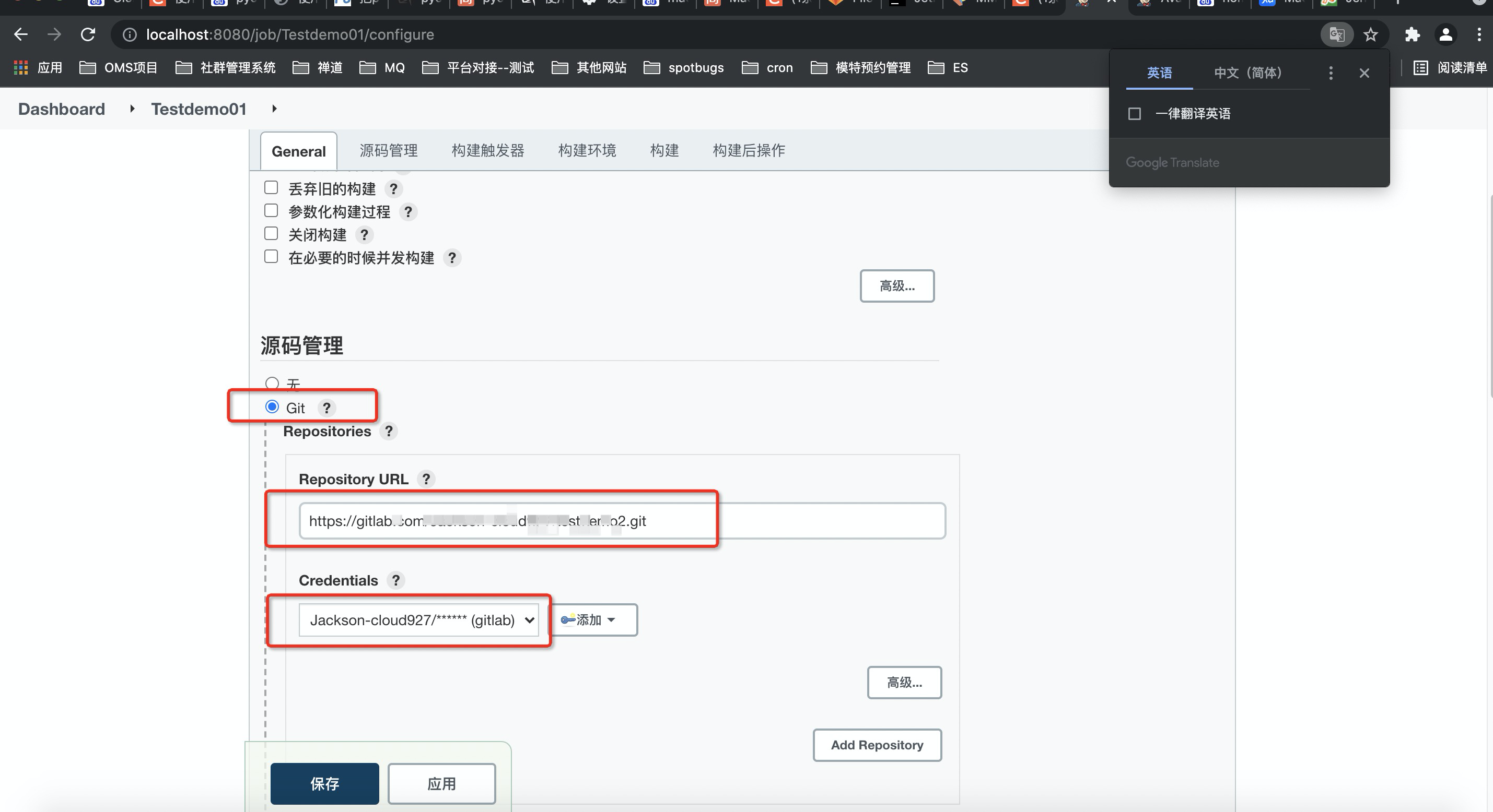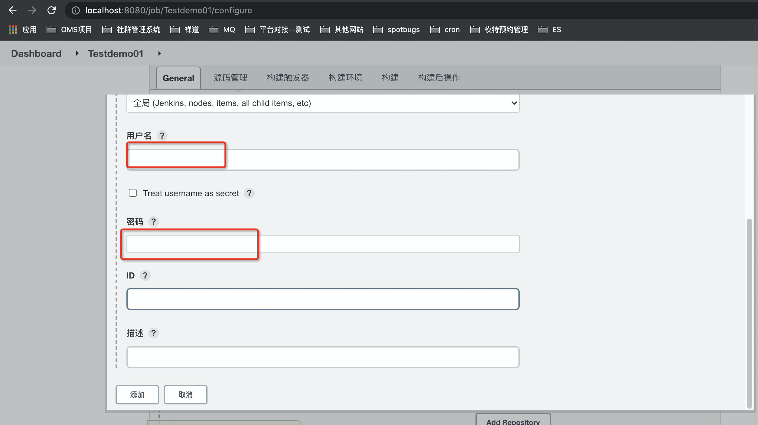 在源码管理这栏,我们填写gitlab上的项目地址,并添加Jkekins凭据提供者,输入gitlab的用户名和密码