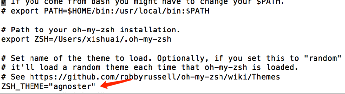 然后,我们编辑 vim ~/.zshrc文件,将主题配置修改为 ZSH_THEME="agnoster"