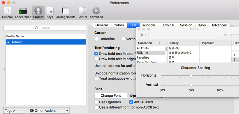 然后打开 iTerm2,按Command + ,键,打开 Preferences 配置界面,然后Profiles -> Text -> Font -> Chanage Font,选择 Meslo LG M Regular for Powerline 字体。