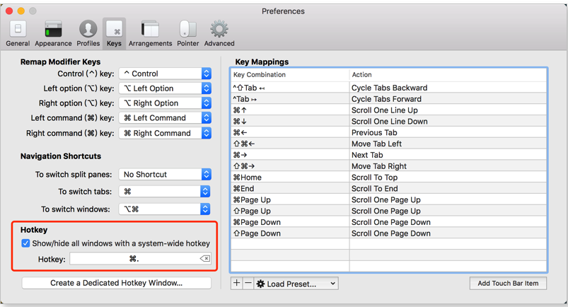 这个功能也非常使用,就是通过快捷键,可以快速的隐藏和打开 iTerm2,示例配置(Commond + .):