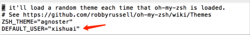编辑 vim ~/.zshrc 文件,增加DEFAULT_USER="xxx"配置,示例: