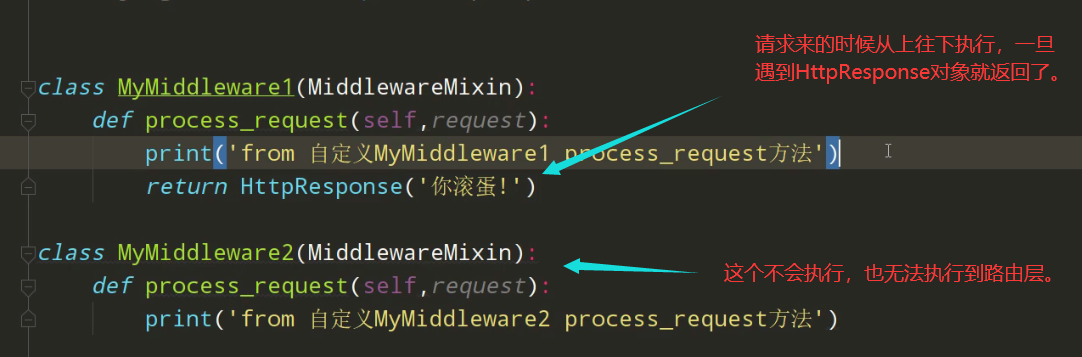 自定义中间件。 1、建个文件夹,建个py文件,写个类,继承MiddlewareMixin 2、中间件里注册(文件夹.文件名.类名) 3、中间件之后才到路由分发层注意:请求来时若用户不符合校验条件直接用HttpResponse返回,响应走时从同级别从下往上执行request_response方法。