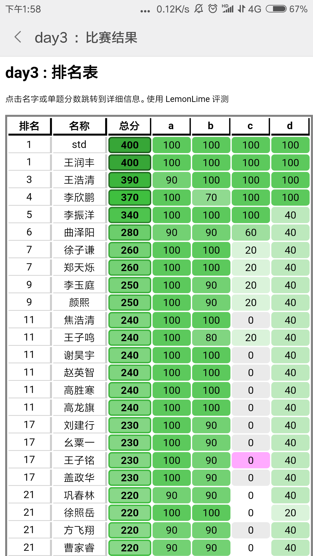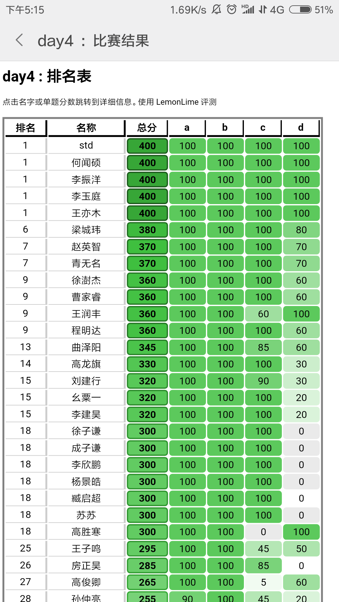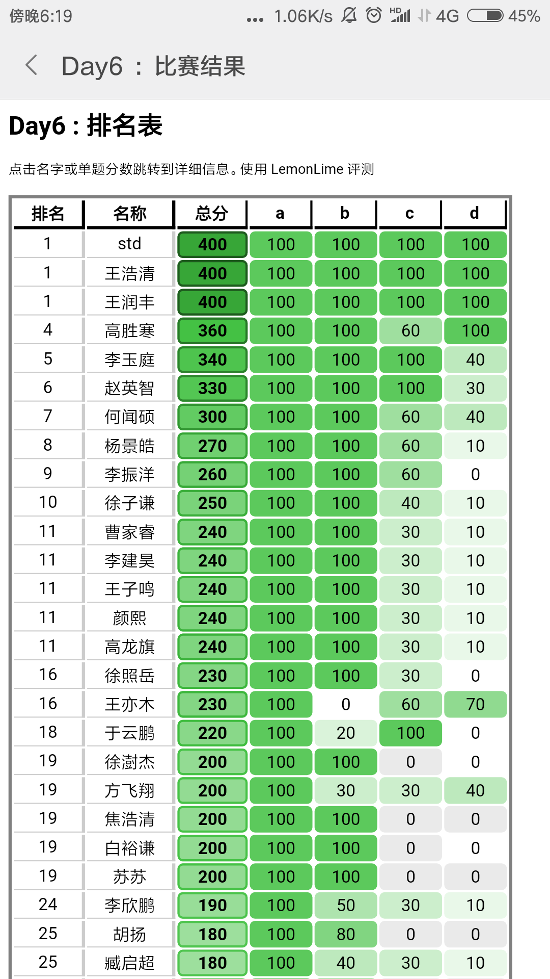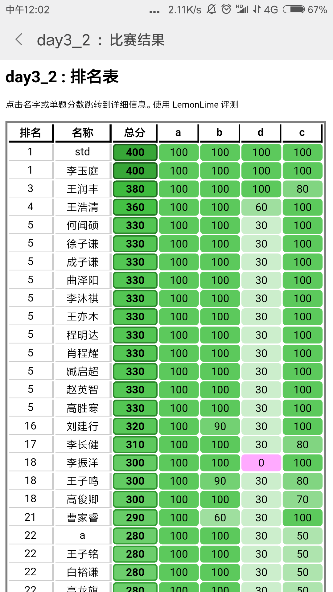 总结: 波动比较大,感觉收获很多。记得 360pts 的那场,当时 std t2 用 cin,cout 被卡成 50pts 了,而我认识的人大多也都挂了很多分。等评测到我的时候,我一直祈祷着不要挂分。评测到 t3 ,在第 14 个点(很多人都在这个点开始被卡了)的时候卡了一会儿,我心里咯噔一下子觉得要没了,然后嗖的一下子就飞了过去!由于时限一开始开大了,t4的暴力一开始飞到了 90 分(后来成 60 了)!当时人都傻了,成为了第一个爆踩 std 的人,第一次觉得被所有人起哄膜拜真的爽~