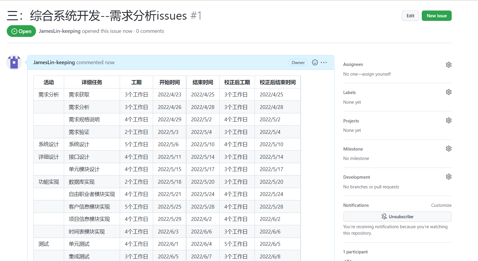 | 需求分析 | 需求获取 | 3个工作日 | 2022/4/23 | 2022/4/25 | 3个工作日 | 2022/4/25 |