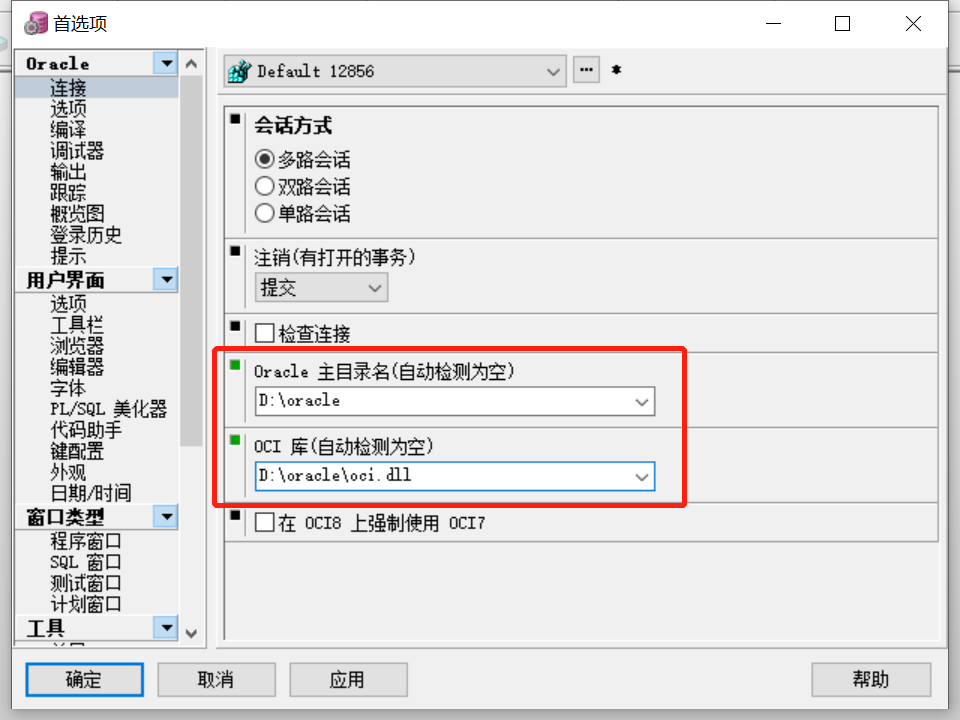 6.修改【Oracle主目录名】和【oci库】,分别改为D:\oracle和D:\oracle\oci.dll,然后点击确定。