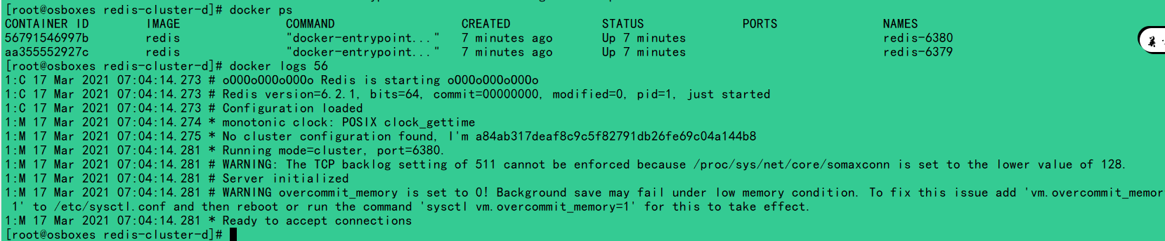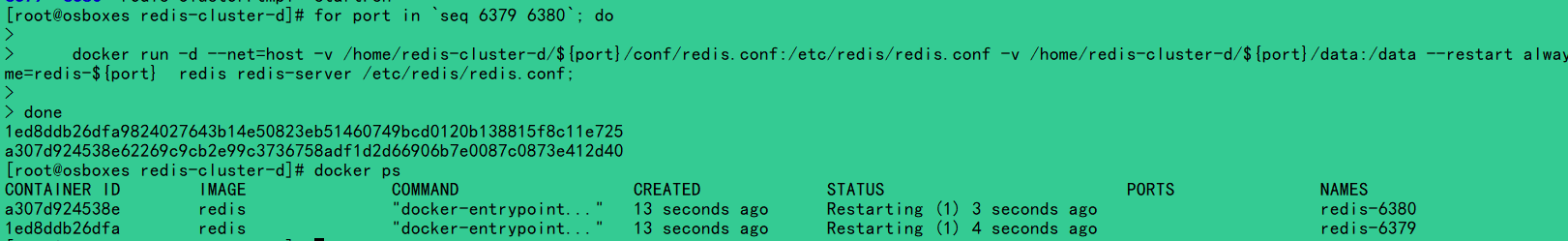 for port in `seq 6379 6380`; do docker run -d --net=host -v /home/redis-cluster-d/${port}/conf/redis.conf:/etc/redis/redis.conf -v /home/redis-cluster-d/${port}/data:/data --restart always --privileged=true --name=redis-${port} redis redis-server /etc/redis/redis.conf; done