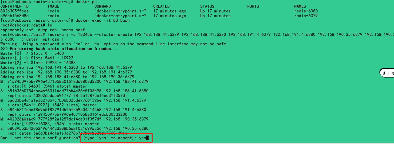 redis-cli -a 123456 --cluster create 192.168.188.41:6379 192.168.188.41:6380 192.168.191.4:6379 192.168.191.4:6380 192.168.190.35:6379 192.168.190.35:6380 --cluster-replicas 1