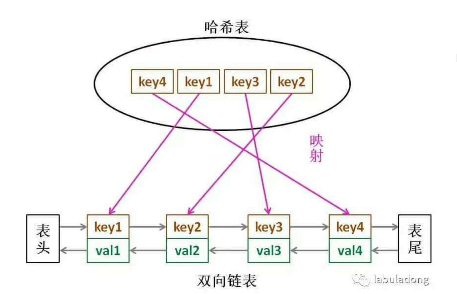 //初始化缓存 public LRUCache(int capacity) { cache=new HashMap<>(); head=new Node(-1,-1); tail=new Node(-1,-1); head.next=tail; tail.pre=head; this.cap=capacity; } public int get(int key) { Node node=cache.get(key); if(node==null) return -1; moveToTail(node,node.val);//最近使用 return node.val; } public void put(int key, int value) { if(cache.containsKey(key)){//已存在则为最近使用,移到末尾 Node node=cache.get(key); moveToTail(node,value); } else { if(cache.size()==this.cap){//cache是否已满 Node node=head.next; delete(node); cache.remove(node.key); } Node newNode=new Node(key,value); insertTail(newNode); cache.put(key,newNode); } } public void insertTail(Node node){ node.pre=tail.pre; node.next=tail; tail.pre.next=node; tail.pre=node; } public void delete(Node node){ node.pre.next=node.next; node.next.pre=node.pre; } public void moveToTail(Node node,int val){ delete(node); insertTail(node); node.val=val; } } class Node{ public int val; public int key; public Node pre; public Node next; public Node(int key,int val){ this.key=key; this.val=val; } }