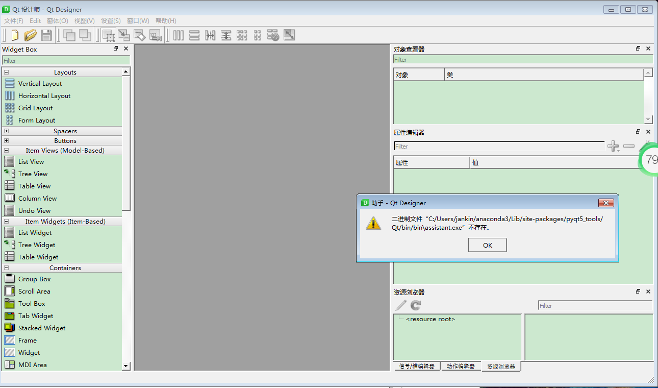 按照报错信息查看相关目录:C:\Users\jankin\anaconda3\Lib\site-packages\pyqt5_tools\Qt\bin\bin,发现不存在该目录,但最后一个bin子目录去掉后的目录即C:\Users\jankin\anaconda3\Lib\site-packages\pyqt5_tools\Qt\bin目录是存在的,且其下有assistant.exe文件。在bin目录下再建了个子目录bin,将上层目录所有文件复制了一份到该目录,发现问题解决了。