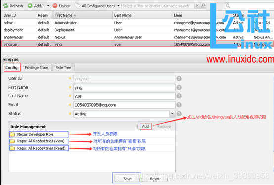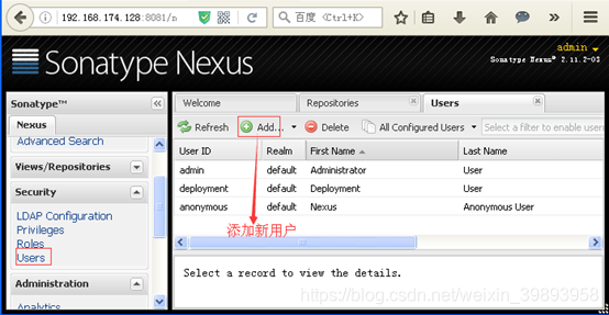 Nexus上预定义了三个用户,用admin登录后,单击页面左边的User链接,看到如下图列表: