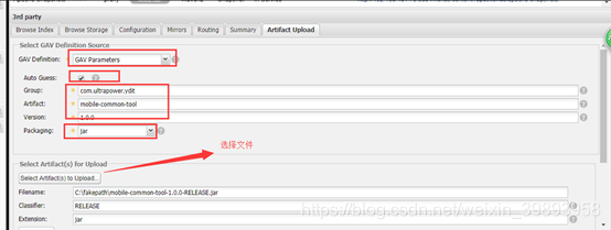 点击select Artifact(s) to upload 按钮,选择要上传的JAR包。