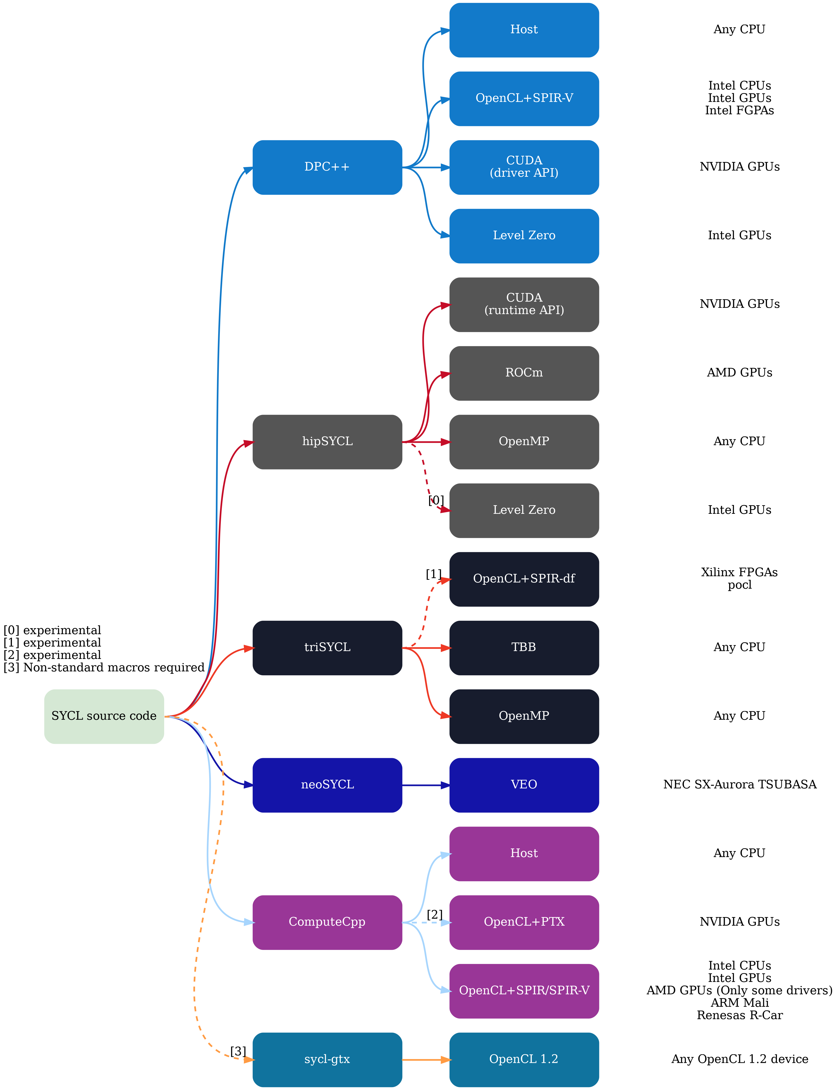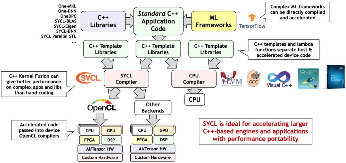 软件框架决定了软件的生命力,其最主要特征是软件功能的适应性,具体包括理论建模支撑、计算模块、 逻辑流程控制和数据分析等模块.随着计算机硬件特性和软件编程语言的发展,许多科学计算软件已不能很好 地适应应用需求,大部分问题是软件的原框架受到冲击导致的.如原有程序采用 Fortran语言编写,后来为了适应 新的运行环境改用 C++实现大规模设计,又需要新的 C++11 改进编程效率,导致软件框架不稳定.其次早期采用 OpenMP 为主的多 CPU 核计算模型,需要转为异构 OpenCL 计算模式;另外由于新的加速设备,原来的 CUDA 程 序可能需要改造为 OpenACC 并行编程方式.以上问题在高性能计算软件的设计中普遍存在,内在原因为软件并 行计算模式较多,硬件体系结构差异大. 对于高性能计算软件来说,优秀的软件框架可提高编程开发效率,适应新的软件需求和用户服务推广.如何 以不变的设计原则应对多变的软件需求是一个关键问题.对于软件框架来说,分层式设计常用方式如通用并行 软件 JASMIN 和格点 QCD 应用软件 Chroma.但从异构计算这方面考虑,面向异构计算环境有机统一计算模拟 的各方面是根本性解决问题,如统一处理器核计算、主存和加速内存管理和网络通信等三大模块,屏蔽异构计 算带来的差异性可以使上层软件设计保持不变性;当前 Khronos 组织发表的 SYCL 规范[36]和 Intel oneAPI[37]正 在建立面向异构计算环境的统一编程接口,SYCL 底层基于 OpenCL 跨平台异构 API 规范,基于 SYCL 的 DPC++ 作为 Intel oneAPI 的主体,已经实现了 Intel GPU 和 Nvidia GPU 的异构加速计算;针对 AMD GPU 常用选择 ROCm 框架下的 HIP 编程方式,而 HIP 实际上能够兼容 CUDA 在 Nvidia GPU 上编译运行,另外,值得注意的是,基于 HIP 也可以实现 SYCL 统一规范[38].