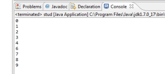 package www; public class stud { /** * @param args */ public static void main(String[] args) { // TODO Auto-generated method stub int i=0; while (i<=9) { if (i!=5) System.out.println(i); i++; } } }