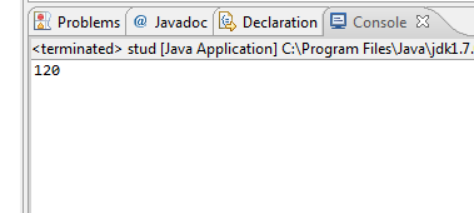 package www; public class stud { /** * @param args */ public static void main(String[] args) { // TODO Auto-generated method stub int i=1; int sum=1; while (i<=5) { sum*=i; i++; } System.out.println(sum); } }