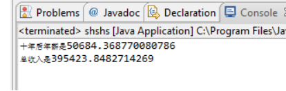 package www; public class shshs { /** * @param args */ public static void main(String[] args) { // TODO Auto-generated method stub double i=30000; int a=1; double sum=0; while (a<=9&&a>=1) { i=i*(1+0.06); sum=sum+i; a++; } System.out.println("十年后年薪是"+i); System.out.println("总收入是"+sum); } }