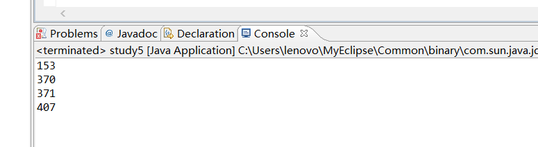 package STA; import java.util.Scanner; public class study5 { /** * @param args */ public static void main(String[] args) { // TODO Auto-generated method stub int x=100; int b,c,d; for ( x = 100; x < 999; x++) { b=x/100; c=x/10%10; d=x%10%10; if (100*b+10*c+d==b*b*b+c*c*c+d*d*d) { System.out.println(x); } } } }