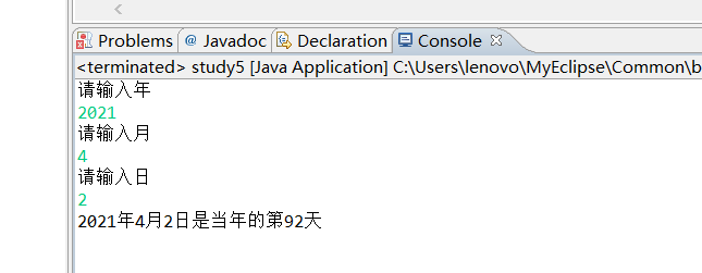 package STA; import java.util.Scanner; public class study5 { /** * @param args */ public static void main(String[] args) { // TODO Auto-generated method stub Scanner input=new Scanner(System.in); System.out.println("请输入年"); int year=input.nextInt(); System.out.println("请输入月"); int month=input.nextInt(); System.out.println("请输入日"); int day=input.nextInt(); int sum=0; switch(month){ case 12: sum += 30; case 11: sum += 31; case 10: sum += 30; case 9: sum += 31; case 8: sum += 31; case 7: sum += 30; case 6: sum += 31; case 5: sum += 30; case 4: sum += 31; case 3: if ((year % 4 ==0 && year % 100 !=0) || year % 400 ==0){ sum += 29; }else{ sum += 28; } case 2: sum += 31; case 1: sum += day; } System.out.println(year + "年" + month + "月" + day + "日是当年的第" + sum + "天"); } }