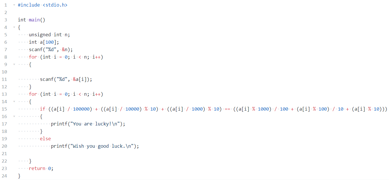 if ((a[i] / 100000) + ((a[i] / 10000) % 10) + ((a[i] / 1000) % 10) == ((a[i] % 1000) / 100 + (a[i] % 100) / 10 + (a[i] % 10)))