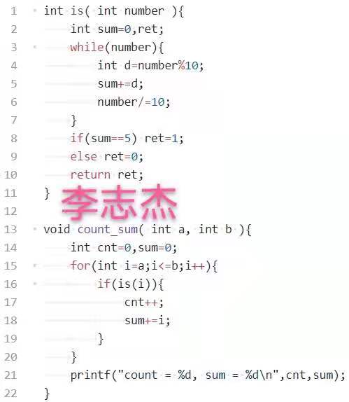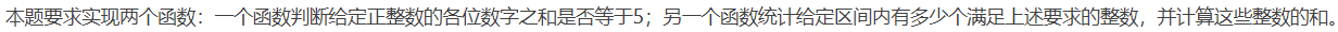 | 104 999 | 104 is counted. count = 15, sum = 3720 | 题目样例 |