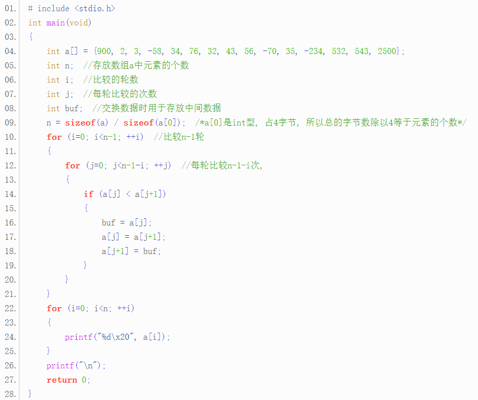 因为冒泡排序有一个特点,这个程序是从大到小排序,所以第一轮排序以后,最小的数就会浮到最右面;第二轮排序以后,第二小的数会浮到倒数第二个位置;第三轮排序以后,第三小的数会浮到倒数第三个位置……也就是说,排序多少轮,就有多少个数字已经按排序要求排好了,它们不需要再比较。写 j<n–1 也可以,只不过程序在执行时多做了许多无用功。