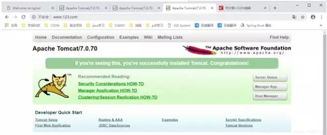 打开浏览器,在浏览器地址栏输入地址 www.123.com,跳转到 liunx 系统 tomcat 主页 面中