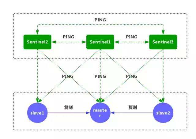 1、每个Sentinel节点都需要定期执行以下任务:每个Sentinel以每秒一次的频率,向它所知的主服务器、从服务器以及其他的Sentinel实例发送一个PING命令。(如上图)