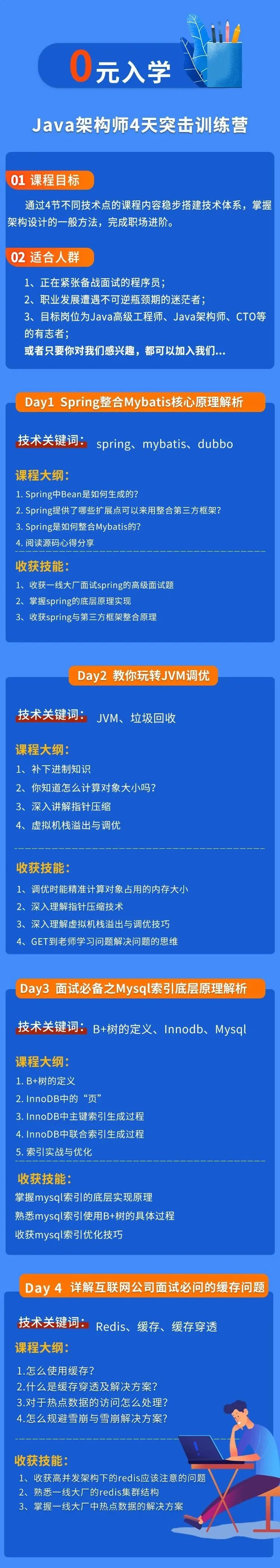 最近有一个针对Java架构师进阶以及面试指导的集训营,通过4节不同技术点的课程内容稳步搭建架构体系,掌握架构设计的一般方法,助力完成职场进阶。5月18日-5月21日,每晚八点深入Spring、JVM、Mysql、Redis底层,入群即可免费听课~