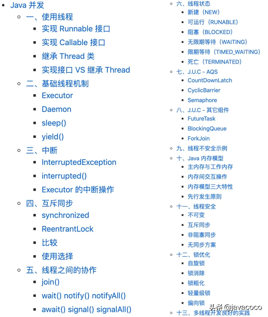 其中包括使用线程的方法、基础线程机制、线程中断、互斥同步、线程之间的协作、线程状态、AQS、JUC其他组件、线程不安全示例、Java内存模型、线程安全、锁优化、多线程开发良好的实战、参考资料。