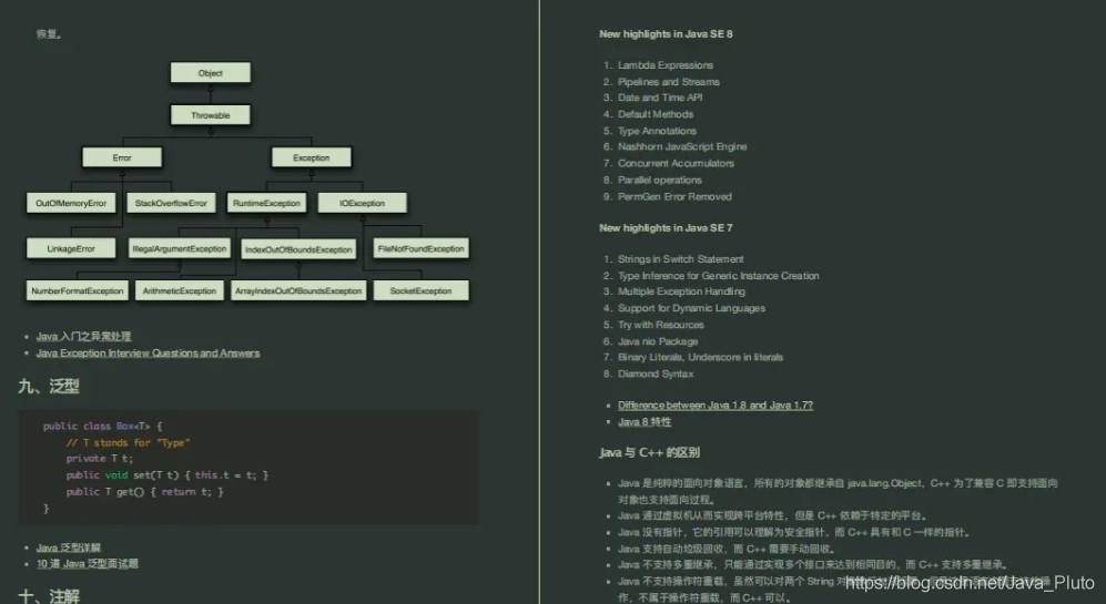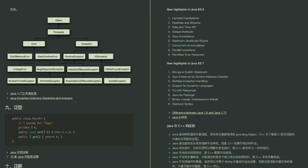 其中包括了数据类型、String、运算、关键字、Object通用方法、继承、反射、异常、泛型、注解、特性等知识点的详细解析,还有参考资料等。
