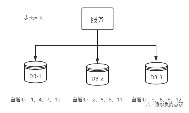 从上图可以看出,水平扩展的数据库集群,有利于解决数据库单点压力的问题,同时为了ID生成特性,将自增步长按照机器数量来设置。