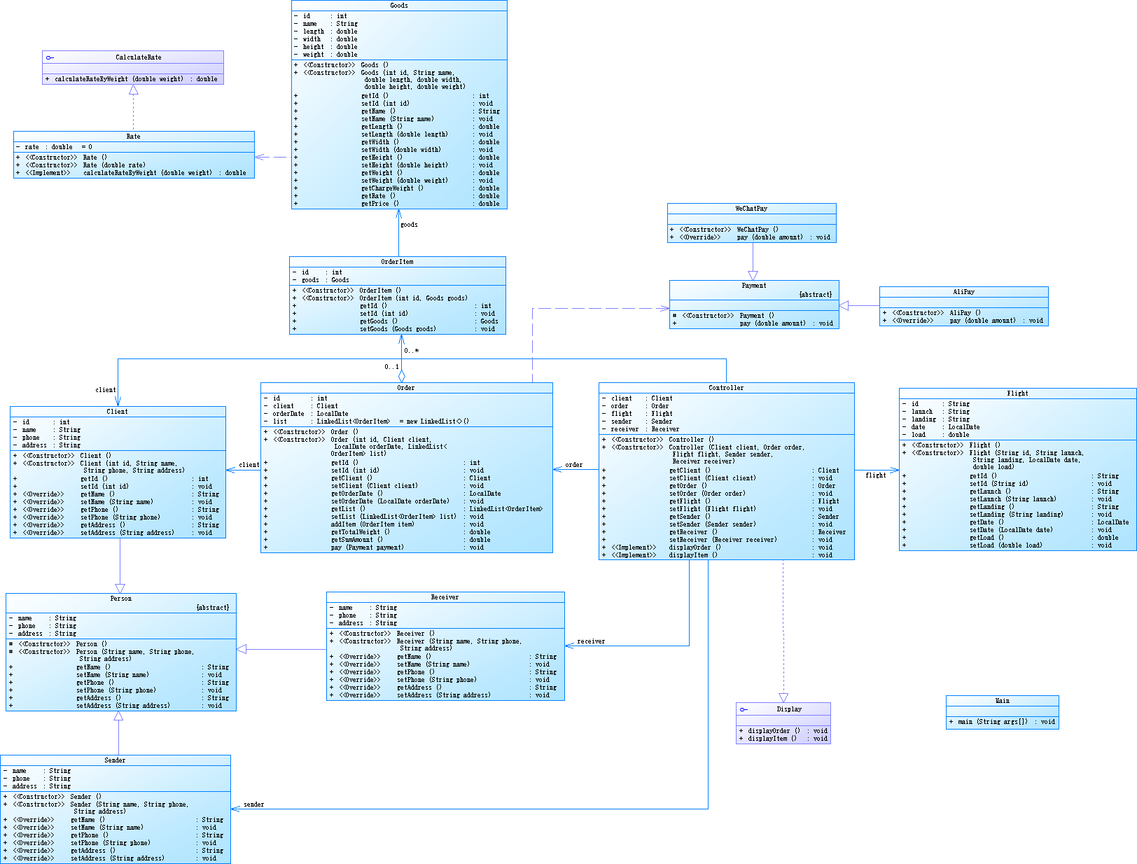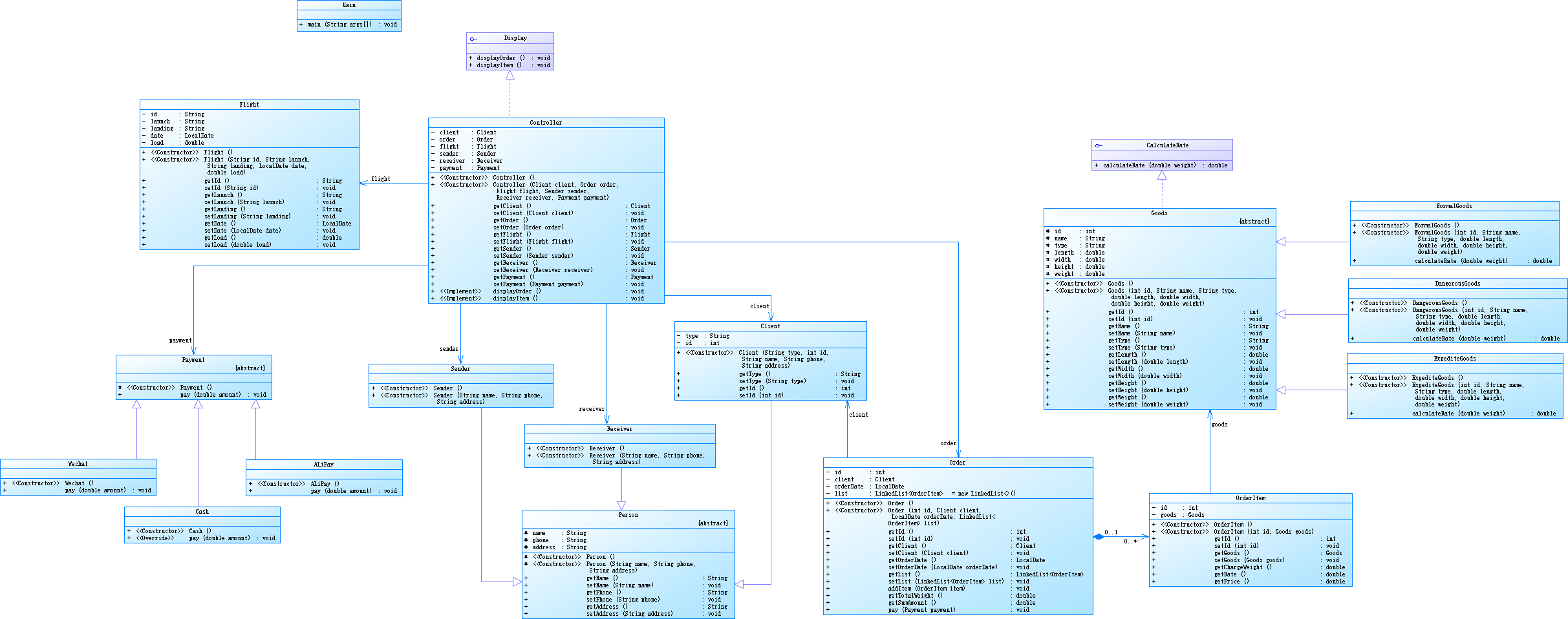 设计了CalculateRate接口和Display接口,CalculateRate接口用于计算费率,由Rate类来实现。Goods类有getChargeWeight()(获取计费重量)、getRate()(获取费率)、getPrice()(获取运费)三个方法,其中getRate()方法依赖于Rate类。OrderItem类(订单项)有Goods类型的属性,Order类(订单)再聚集订单项。Person类为抽象类,Client类(客户)、Sender类(寄件人)、Receiver类(收件人)都继承自Person类,Order类有Client类型的属性。Payment类为抽象类,WeChatPay类(微信支付)、AliPay类(支付宝支付)都继承自Payment类,Order类的pay()方法要依赖Payment类。Controller类用于把要输出的内容综合在一起,如Cilent、Order、Flight(航班)、Sender、Receiver,再通过实现Display接口来做到展示订单信息和货物明细。