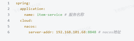 配置Nacos:在item-service的application.yml中添加nacos地址配置: