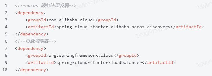 服务发现除了要引入nacos依赖以外,由于还需要负载均衡,因此要引入SpringCloud提供的LoadBalancer依赖。我们在cart-service中的pom.xml中添加下面的依赖: