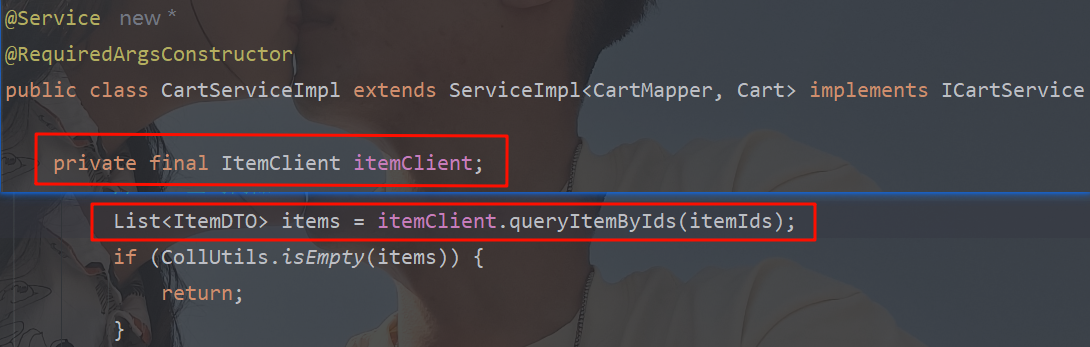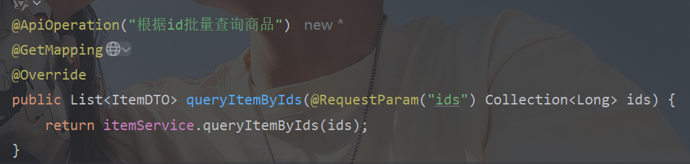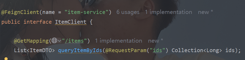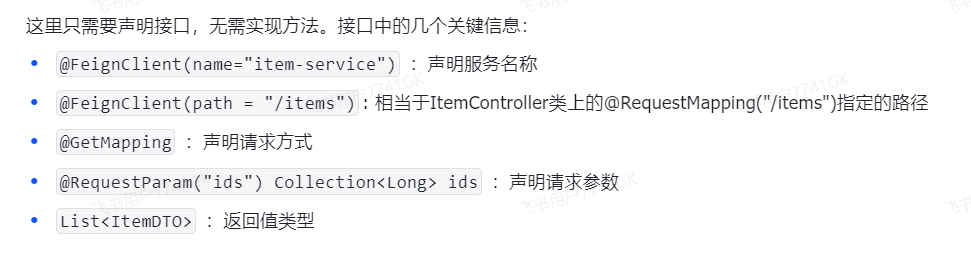 在cart-service中,定义一个新的接口,该接口将来通过OpenFeign去访问商品服务中ItemController类的方法,所以参考商品服务的ItemController类去编写Feign接口