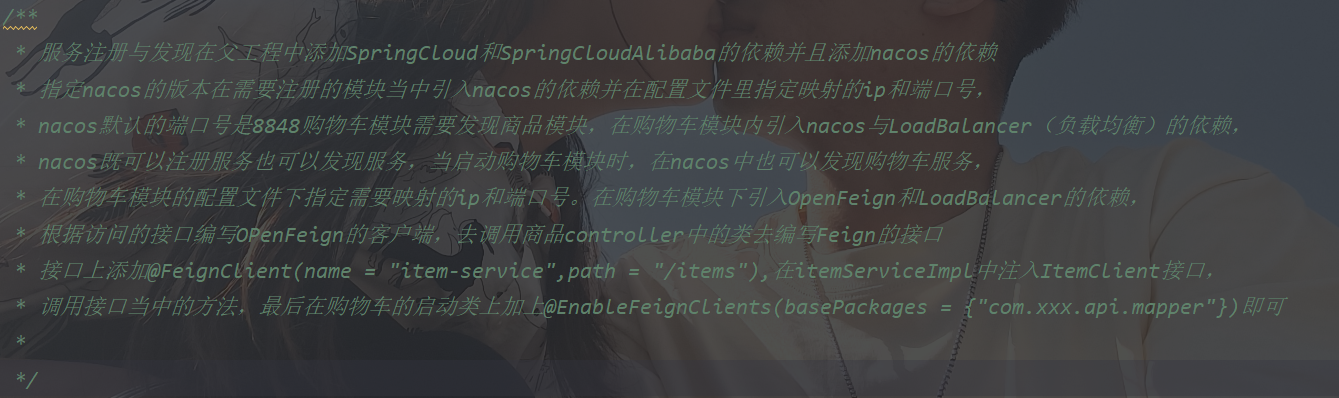 可以发现,这里Nacos的依赖与服务注册时一致,这个依赖中同时包含了服务注册和发现的功能。因为任何一个微服务都可以调用别人,也可以被别人调用,即可以是调用者,也可以是提供者。因此,等一会儿cart-service启动,同样会注册到Nacos