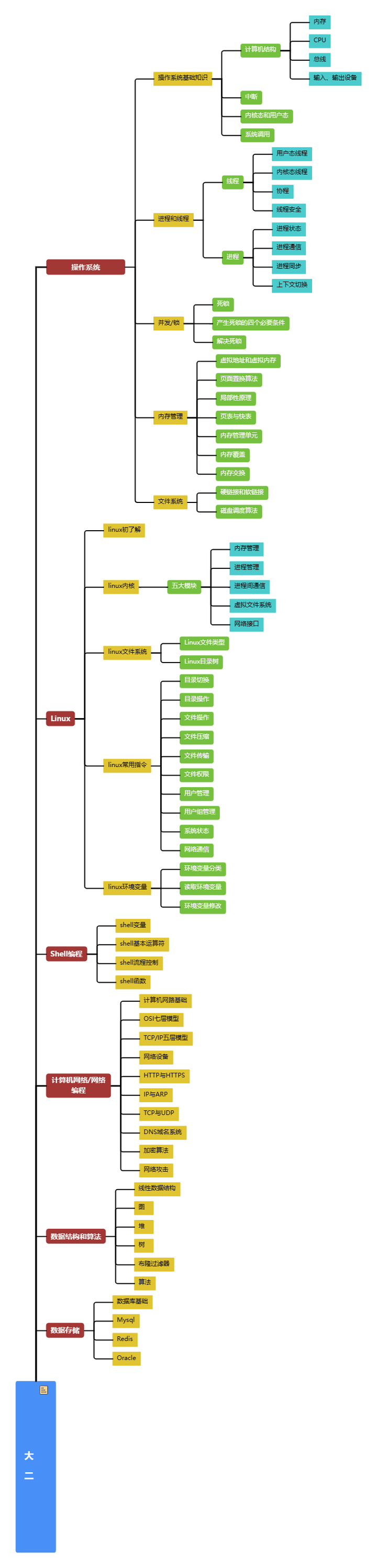 在这里鸟哥将大二的学习内容分为了6个部分,分别为操作系统、Linux、Shell编程、计算机网络/网络编程、数据结构和算法、数据存储。其中前三个都归属于计算机系统,Linux也是操作系统之一,Shell编程又是Linux环境下比较流行的自动化运维语言了,工作中不可或缺的一个知识点。