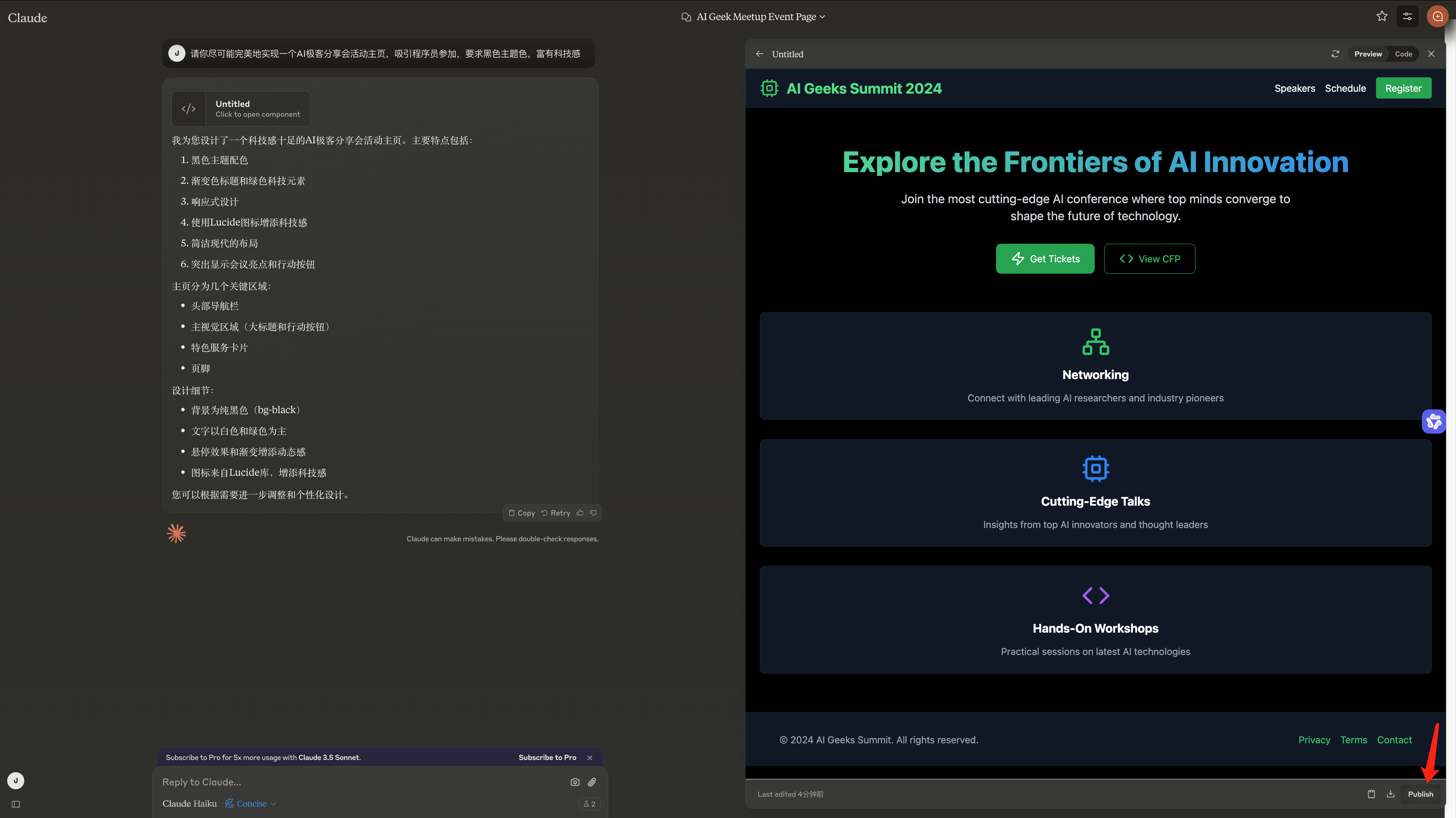 左侧对话框继续细化需求,让它优化代码,同时在右侧 Preview 面板预览。