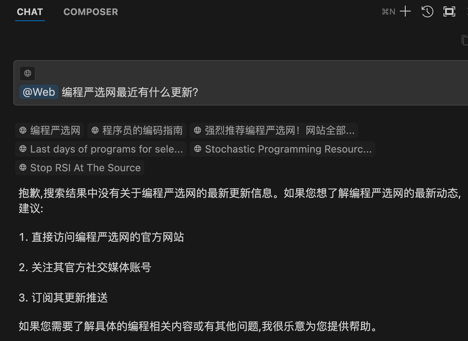 在输入框输入 @web 即可联网检索,具备 AI 搜索产品标准的 RAG 能力: