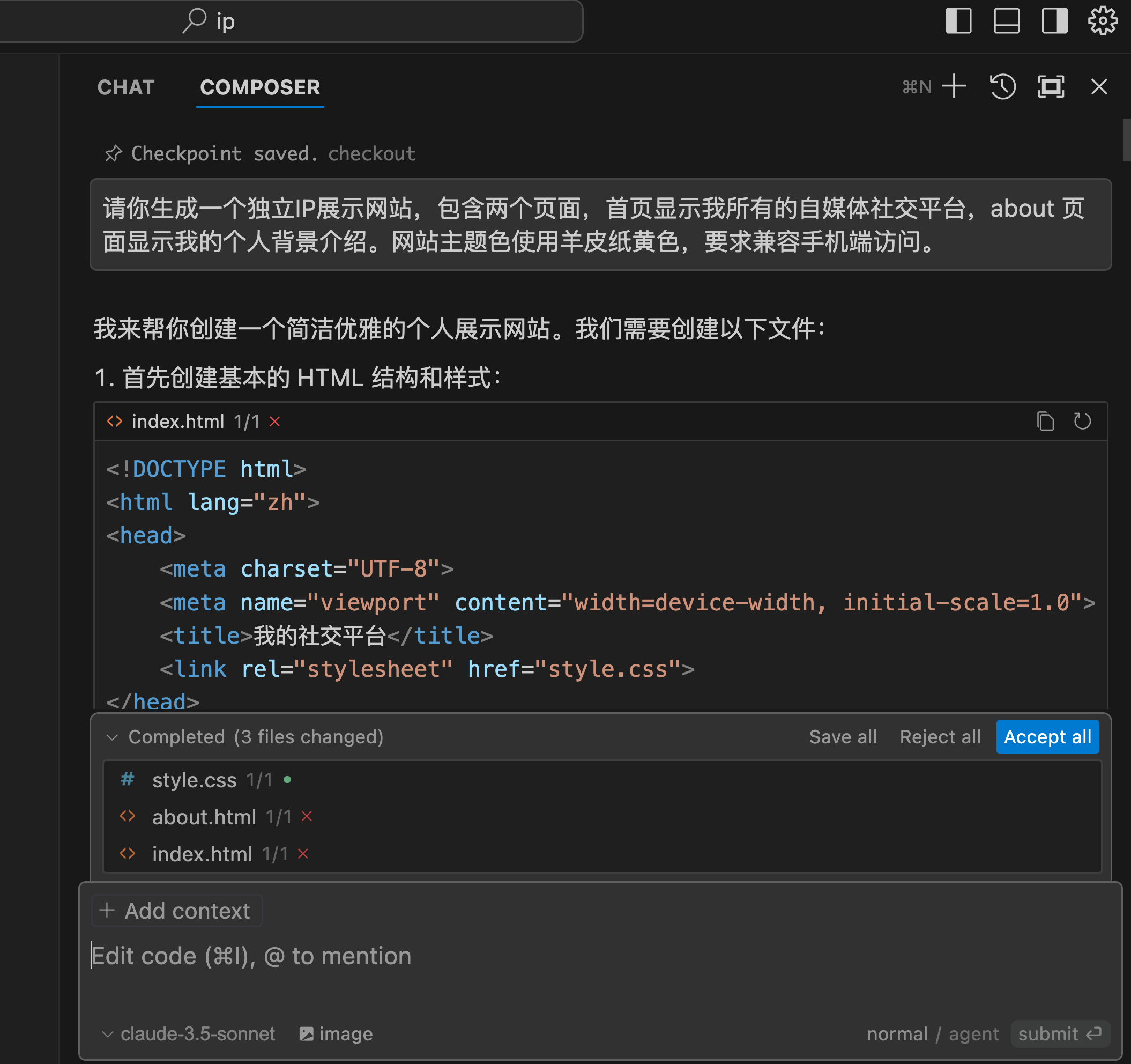 repeat这过程:enter你的需求 -> Accept all 应用修改 -> 预览。直到网站让你顺眼了。